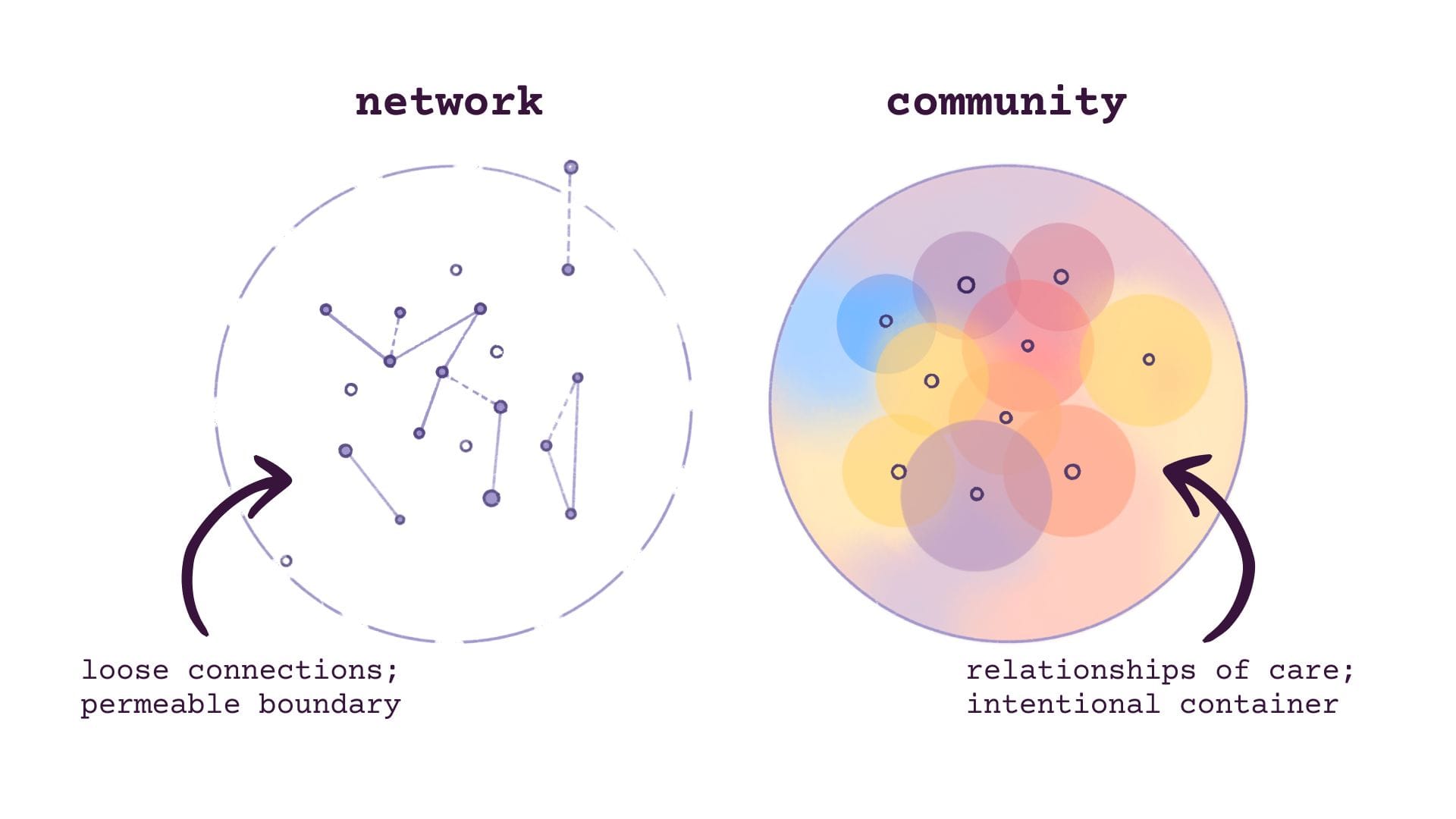 while i, too, often refer to myself as a community builder, this is mainly because it's an identity that others can readily grasp without much context. but lately, i'm trying to use the word "community" more intentionally – in part because i think it is frequently misapplied to what are actually *networks*. i want to explicitly differentiate between these two, because I believe communities require far more finesse and intentionality to cultivate.